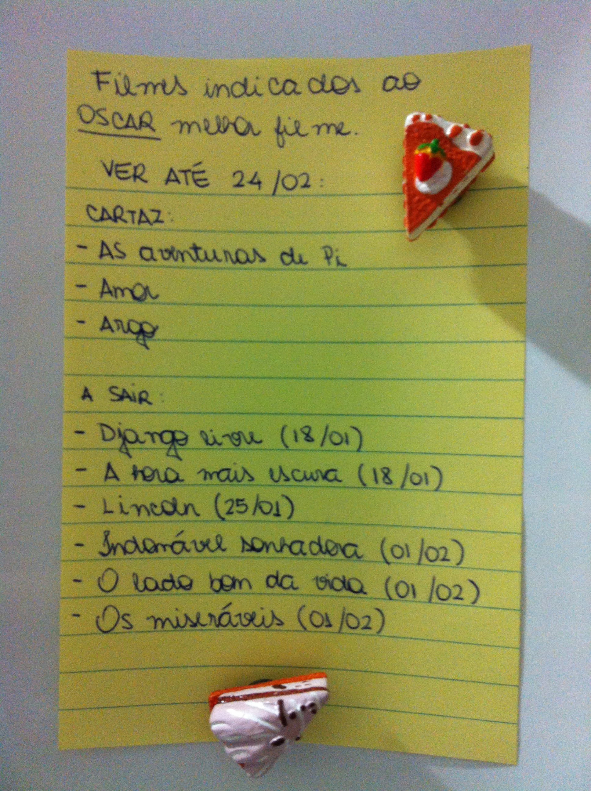 Depois da indicação dos filmes ao Oscar de ontem, decidi colocar uma nova meta para 2013: assistir aos filmes antes da premiação. Pretendo assistir a todos os filmes concorrendo à categoria de melhor filme do ano até 24/02/2013 – data da premiação.