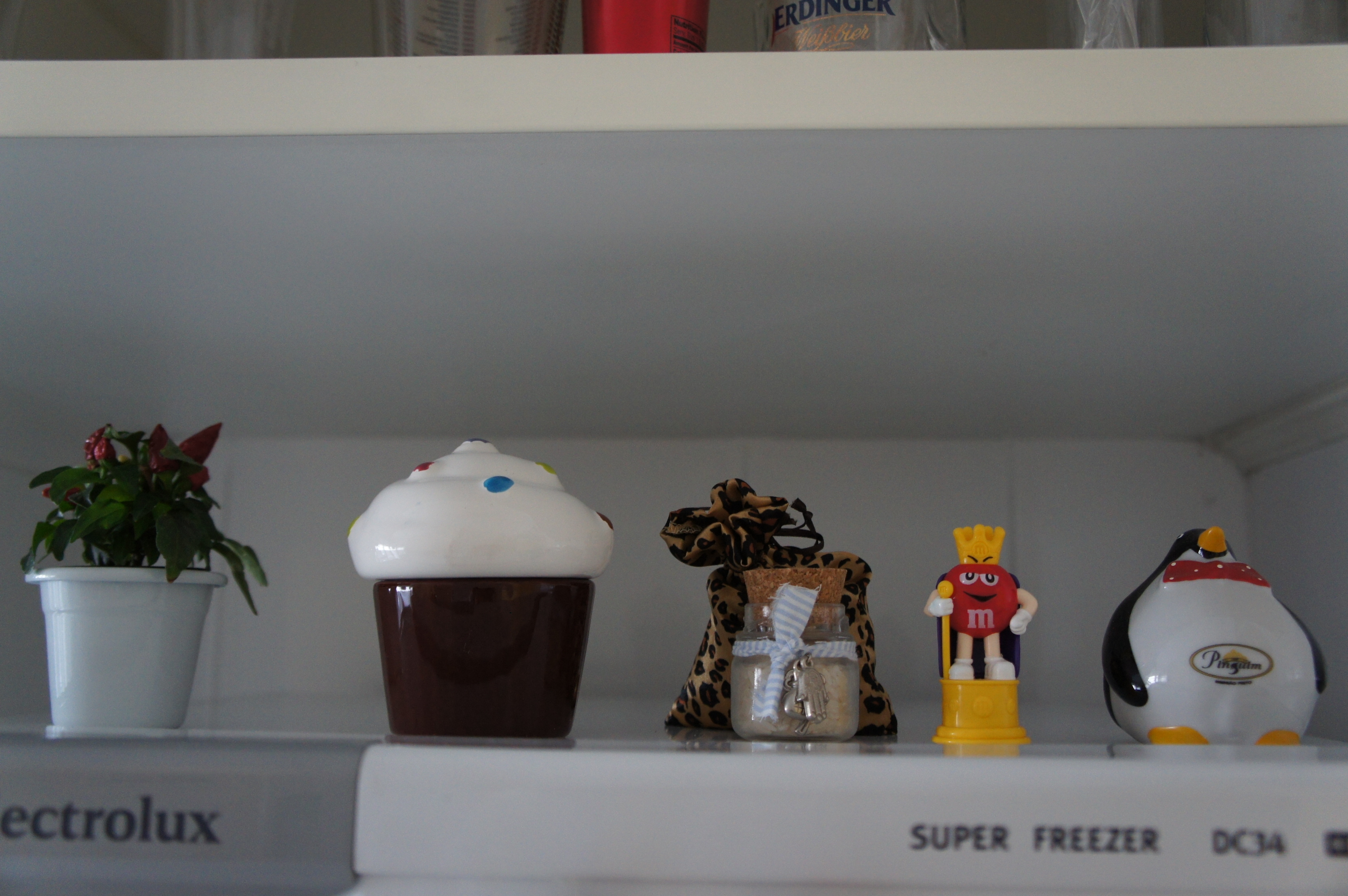 Ganhei um potinho de arroz pra nunca faltar comida em casa e um saquinho com sal grosso (de onça, mais a minha cara impossível!) para espantar a inveja e mau olhado. Então veio o M&M’s para que nunca falte chocolate em casa (senão minha irmã não vem mais aqui… :P) e o cupcake que ganhei de Natal – ainda estou procurando um significado pra ele; ele simplesmente ficou fofo neste lugar que estou tentando justificar sua estadia…