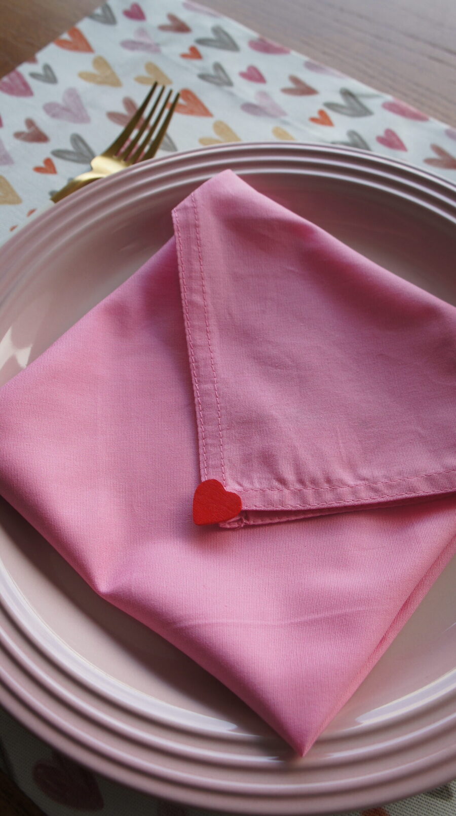 3. Guardanapo com Dobra Especial: o guardanapo rosa é dobrado em formato de envelope e então é finalizado com um pequeno coração vermelho – um detalhe simples que faz toda a diferença! Essa dobra é fácil de fazer: dobre o guardanapo ao meio, depois dobre novamente criando um triângulo e finalize com o coração decorativo. Fica simples e muito charmoso.